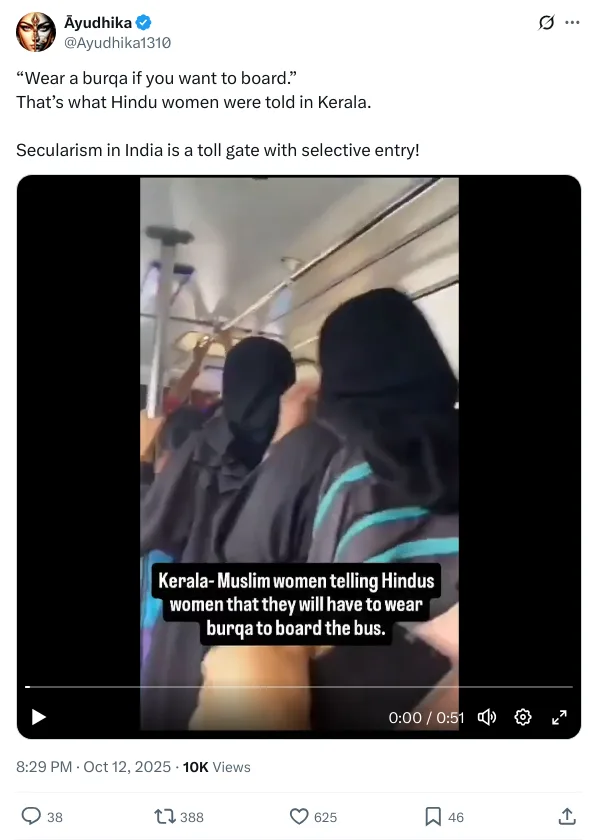 A social media user from X(formerly Twitter) shared a video on October 12, 2025, with the caption,““Wear a burqa if you want to board.” That’s what Hindu women were told in Kerala. Secularism in India is a toll gate with selective entry! (sic).” The post got around 10,000 views.