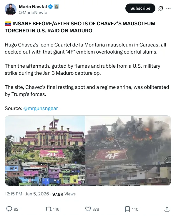 Mario Nawfal, a Lebanese-Australian entrepreneur, business influencer, podcast host, and political commentator, shared a photo on January 5 on X (formerly Twitter), allegedly showing the mausoleum before and after the US airstrike. The caption of the post reads, “ INSANE BEFORE/AFTER SHOTS OF CHÁVEZ’S MAUSOLEUM TORCHED IN U.S. RAID ON MADURO Hugo Chavez’s iconic Cuartel de la Montaña mausoleum in Caracas, all decked out with that giant ‘4F’ emblem overlooking colorful slums. Then the aftermath, gutted by flames and rubble from a U.S. military strike during the Jan 3 Maduro capture op. The site, Chavez’s final resting spot and a regime shrine, was obliterated by Trump’s forces.”