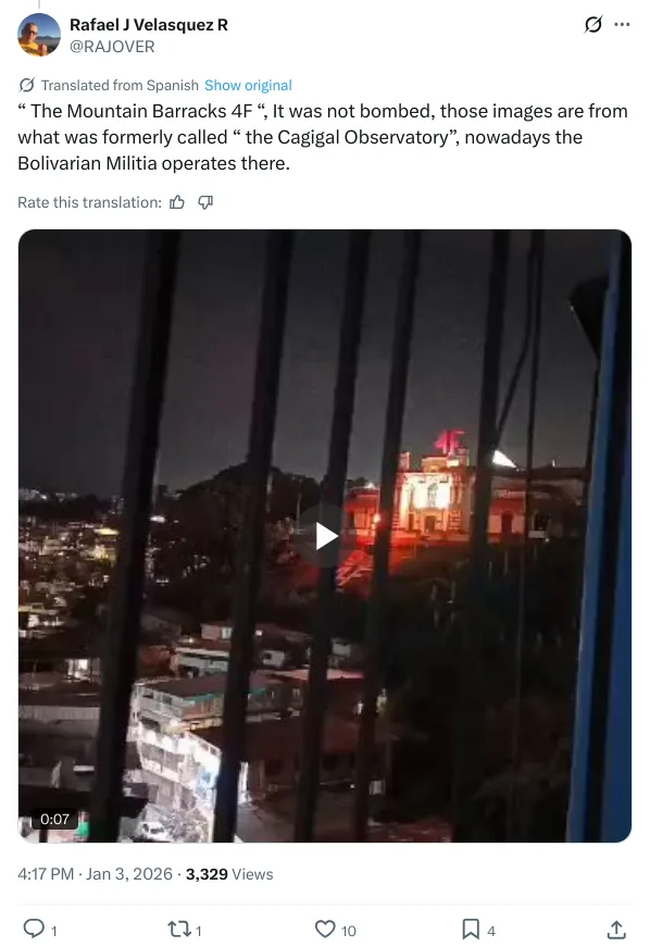 We performed a keyword search using the keyword “Mountain Barracks 4F”, and found an X post shared on January 3, indicating that Hugo Chavez’s mausoleum is unharmed, and the structure targeted is the Cagigal Naval Observatory.