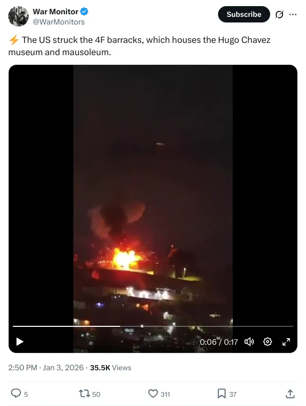 A video also recently gained popularity on the internet, allegedly depicting the airstrike aimed at the mausoleum. On January 3, an X account, War Monitor, shared a video with the caption, ”The US struck the 4F barracks, which houses the Hugo Chavez museum and mausoleum,” suggesting that the airstrike demolished the structure.