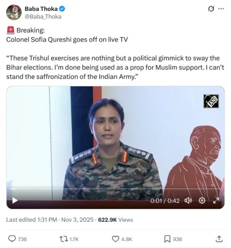 X users recently shared a 42-second video on November 3, 2025, allegedly showing Colonel Sofia Qureshi claiming that the Indian Army is being saffronised and that the Tri-Services Exercise (TSE-2025) “Trishul” is merely a ploy by the ruling NDA to gain an advantage in the upcoming Bihar elections