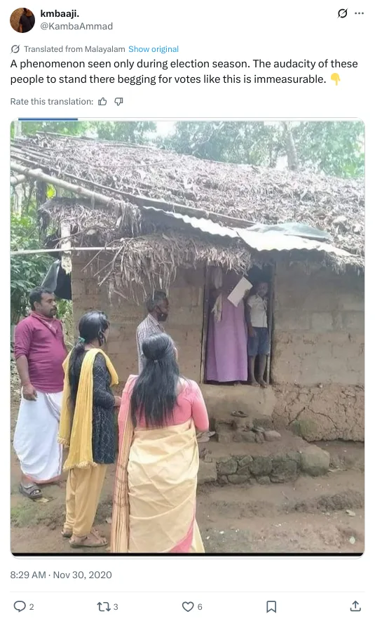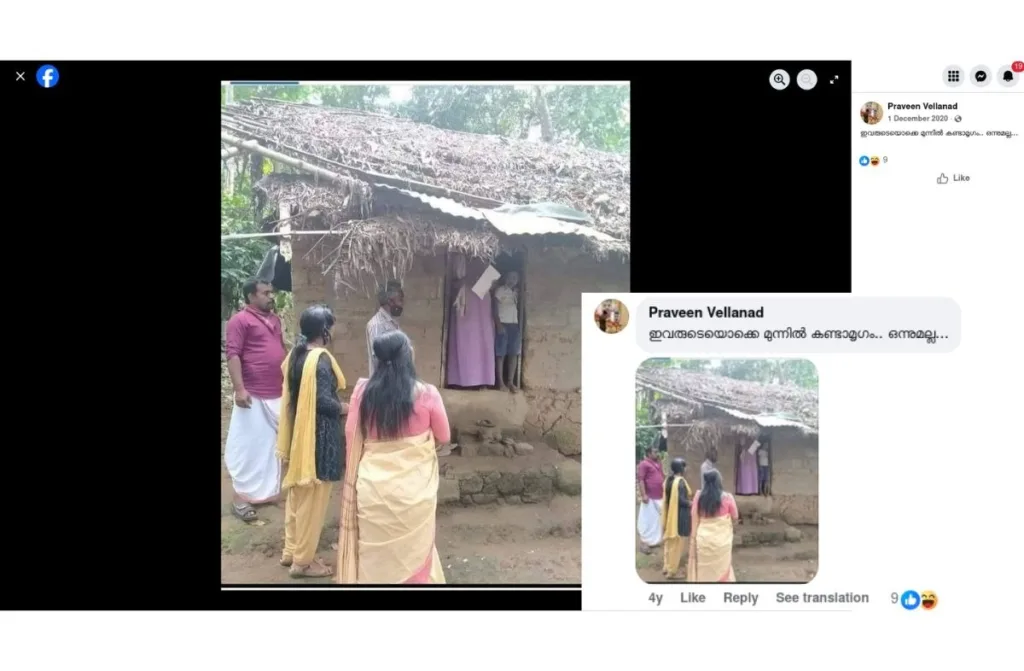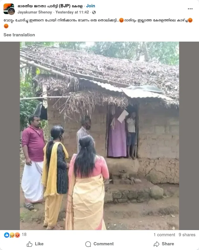 A photo circulating on social media shows a few individuals standing outside a dilapidated hut. The captions claim that the image shows members of the ruling Left Democratic Front (LDF) standing outside a home during their election campaign in Kerala. The post further suggests that the photo depicts a “Kerala without poverty,” mocking the state’s achievements in poverty eradication. However, the image is old and unrelated to the upcoming elections. Therefore, the viral claim is false.