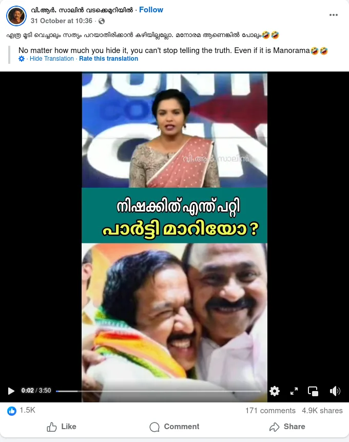 A Facebook user shared a video on October 31, 2025, with a Malayalam caption that translates to, “No matter how much you hide it, you can’t stop the truth — even if it’s Manorama.” The post allegedly shows Nisha Purushothaman criticizing the Congress for hindering the ruling government’s efforts to bring progress and development to the state. The post received around 4,900 shares and 1,600 likes.