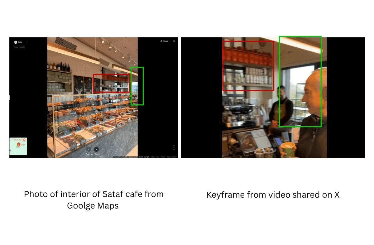 An analysis of the shop’s interior photo alongside the video keyframes verified the location.
