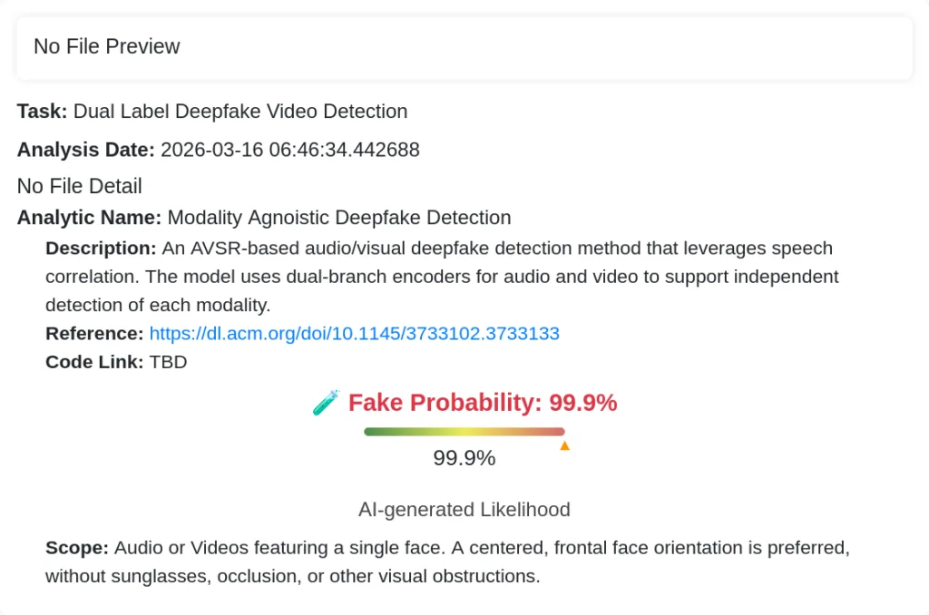 The University at Buffalo’s DeepFake-O-Meter platform indicated that there is a 99.9% probability that the video is generated by AI.
