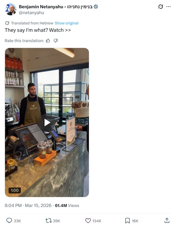 On March 15, Benjamin Netanyahu’s official X (formerly Twitter) account shared a video with a Hebrew caption that translates to,“They say I’m what? Watch >>.” The video features Benjamin Netanyahu in a cafe casually having a coffee.
