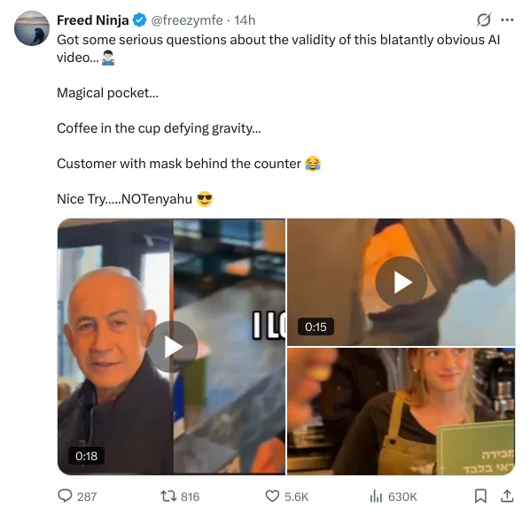 Netizens responded to the video, suggesting that the footage is fake. A user, Freed Ninja, alleged several discrepancies, such as unusual movement of Benjamin Netanyahu’s jacket pocket, coffee defying gravity, and also pointed out that a customer with a mask behind the counter looks suspicious.