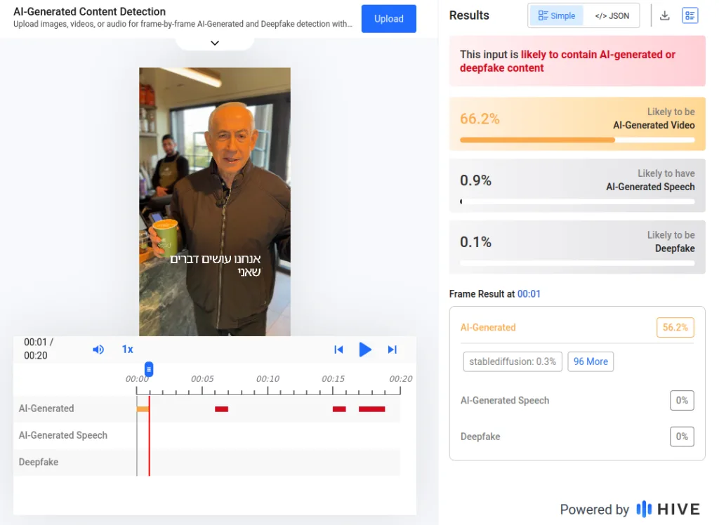 We analyzed the video using the AI detection tool Hive Moderation, and the result indicates a probability of 66.2% that the video is AI-generated.