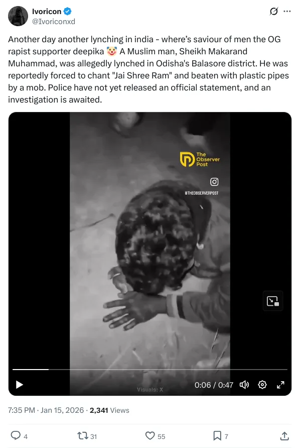 An X (formerly Twitter) user shared the video of the incident, questioning the atrocity. The caption reads, “Another day, another lynching in India – where’s saviour of men the OG rapist supporter deepika 🤡 A Muslim man, Sheikh Makarand Muhammad, was allegedly lynched in Odisha’s Balasore district. He was reportedly forced to chant “Jai Shree Ram” and beaten with plastic pipes by a mob. Police have not yet released an official statement, and an investigation is underway.”