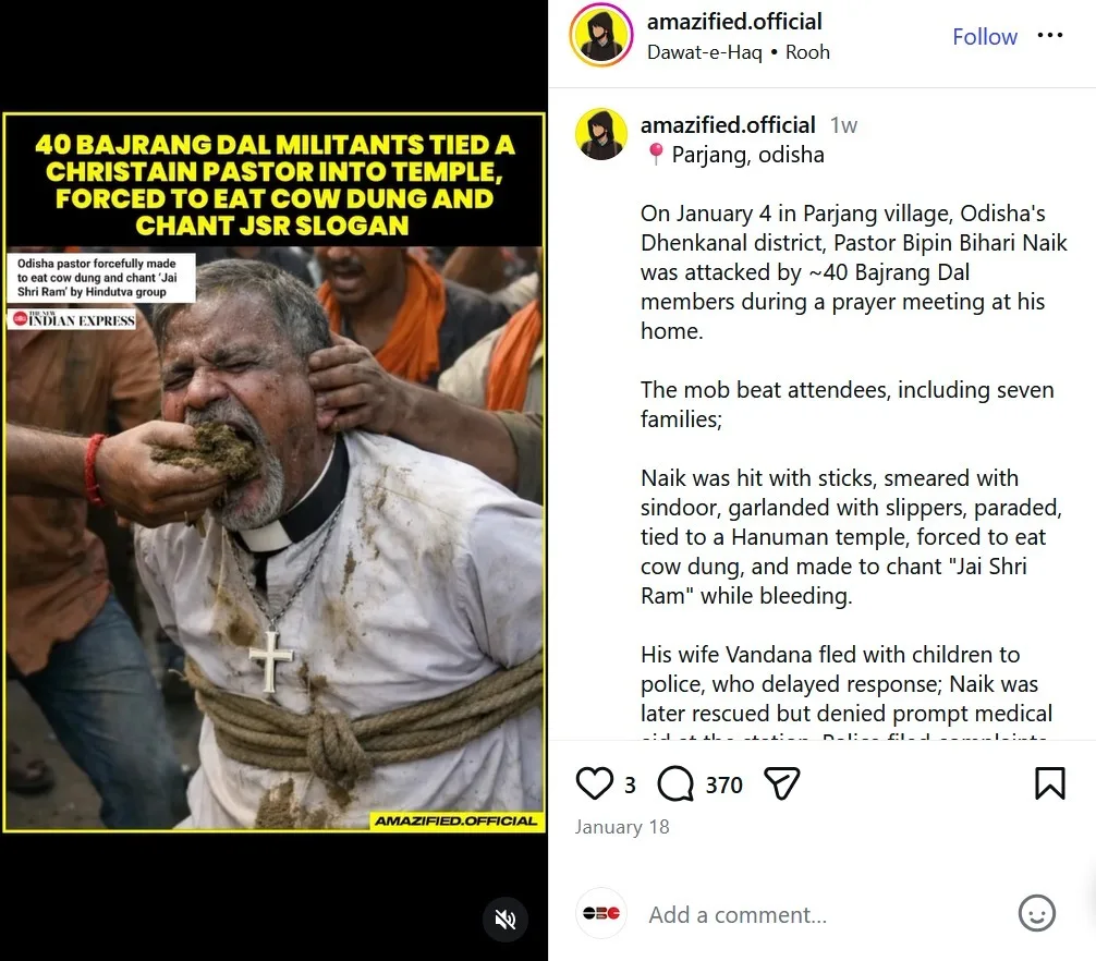 On January 4, an incident occurred in Odisha’s Dhenkanal, a mob of forty people targeted a pastor while he was attending a prayer meeting at a house in Parjang village along with his family and a few others. The New Indian Express reported the incident on January 17. The village is a Hindu-majority village with only seven Christian families. The mob accused the pastor, identified as Bipin Bihari Naik, of conducting forced conversion and was reportedly beaten with sticks and paraded throughout the village with a garland of slippers and red sindoor smeared all over his face. According to his wife’s statement, the pastor was tied to a Hanuman temple in the village, forcing him to eat cow dung and chant “Jai Shree Ram”. The police registered the FIR, but a counter FIR was also filed against the pastor on the allegation of forced conversion.