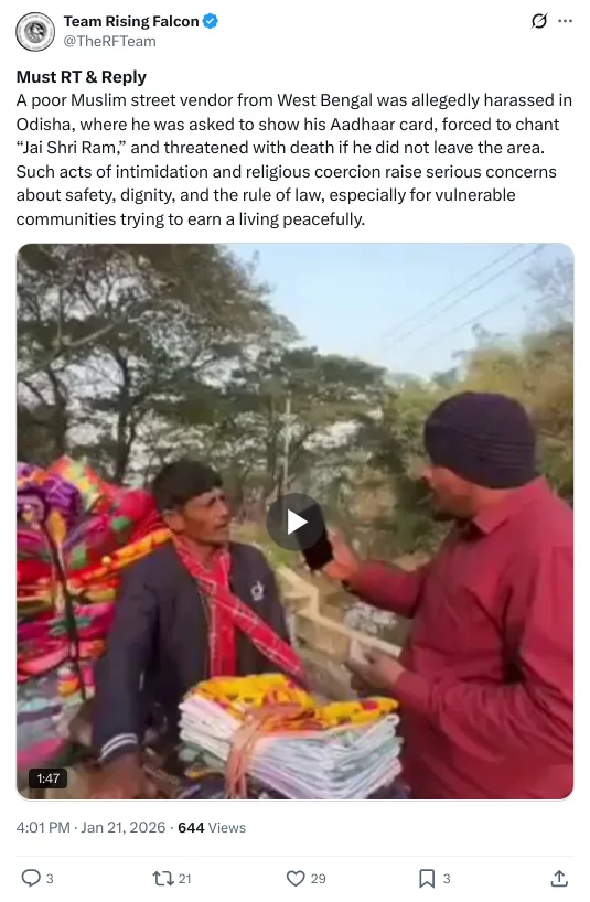 A trend targeting Muslim vendors is on a rise recently in different parts of India, where vendors are harassed and asked to chant “Jai Shree Ram”. Two separate incidents allegedly from Orissa suggest that Muslim vendors from West Bengal’s Hooghly being intimidated by individuals and forced to chant “Jai Shree Ram”. X users shared the video of the incident on January 21 and January 22.