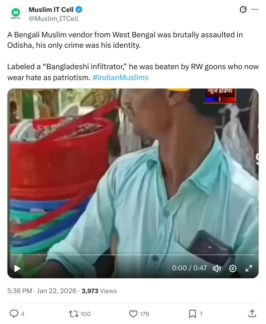 The X post shared on January 21 shows an individual asking a street vendor selling blankets about his whereabouts. When the vendor states that he is from Hooghly in West Bengal, the individual asks for the Aadhar card and calls him a “Bangladeshi”. In a similar manner, the X post from January 22 shows another street vendor being harassed and assaulted, calling him a Bangladeshi citizen. The individuals can be heard asking the vendor to clear the area.