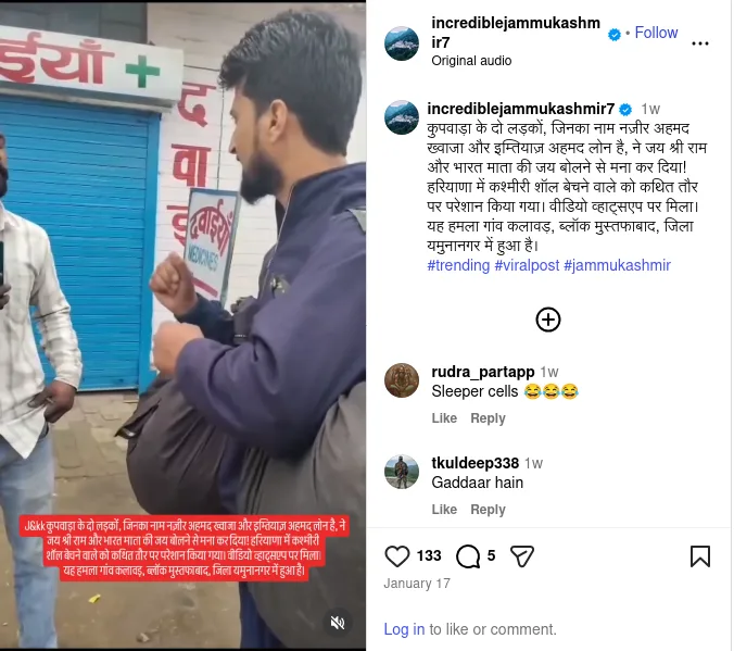 In a similar incident that occurred in Yamunanagar, Haryana, a local resident harassed a Kashmiri youth selling shawls. The Instagram account incrediblejammukashmir7 shared the video of the incident on January 17.