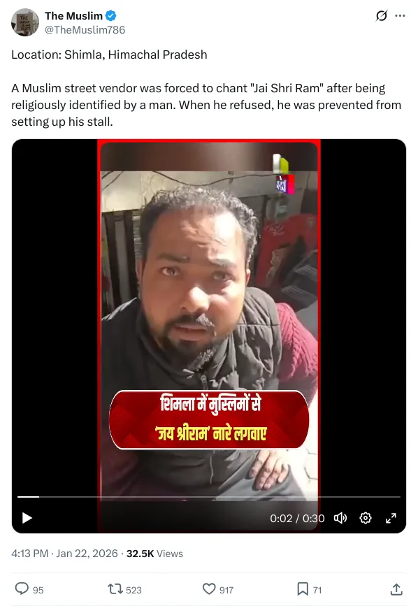 The video shows Muslim street vendors being asked by an individual to chant “Jai Sree Ram”. The Amar Ujala report dated January 21 identifies the individual as Rahul Sharma, a social media influencer and reveals that the incident occurred in Theog, a town in Shimla. According to the report, the Theog police summoned the influencer, took down the video, and asked him to issue an apology.