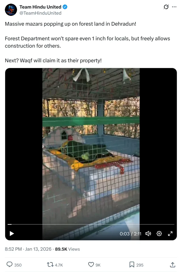 On January 13, Team Hindu United shared the video of the shrine on X with a caption,”Massive mazars popping up on forest land in Dehradun! The Forest Department won’t spare even 1 inch for locals, but freely allows construction for others. Next? Waqf will claim it as their property!”