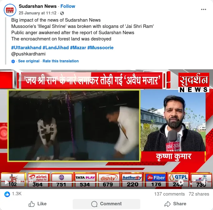The Hindi caption of the video report shared on Facebook on January 25 translates to, “Big impact of the news of Sudarshan News Mussoorie’s ‘Illegal Shrine’ was broken with slogans of ‘Jai Shri Ram’. Public anger was awakened after the report of Sudarshan News. The encroachment on forest land was destroyed.”