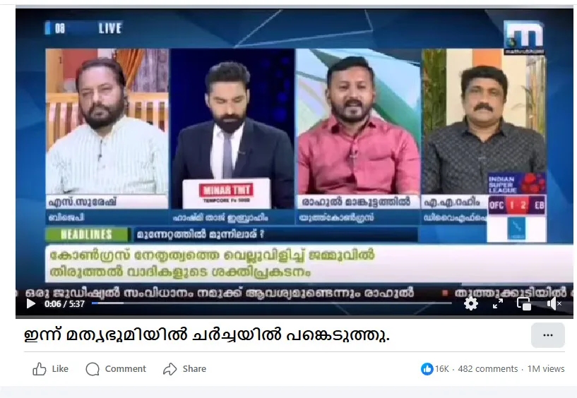 In March, he posted 19 channel debate snippets, which consistently garnered between 50,000 and 5 lakh views. He participated in debates on a wide array of topics, including faith, irregularities in voters’ lists, the love jihad controversy, and Pinarayi Vijayan’s PR work. The comment sections often highlighted the “proper homework he does” for these debates, as he was seen speaking with the support of official documents such as Parliament and Assembly question answers, court orders, and official statistics — something none of his contemporary Congress spokespersons had done on public platforms.