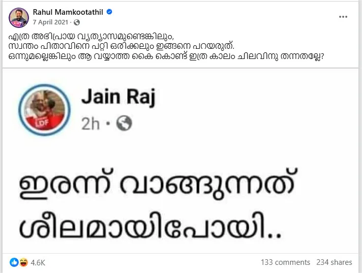 One of the 20,000 comments on the post read like this: “Rahul, move forward legally. Full support. Oommen Chandy was also called a rapist in the media trial. What happened then? Chandy sir was a scapegoat that the ‘presstitutes’ got then. Now that scapegoat is you.” The comment itself has over 1,200 likes.