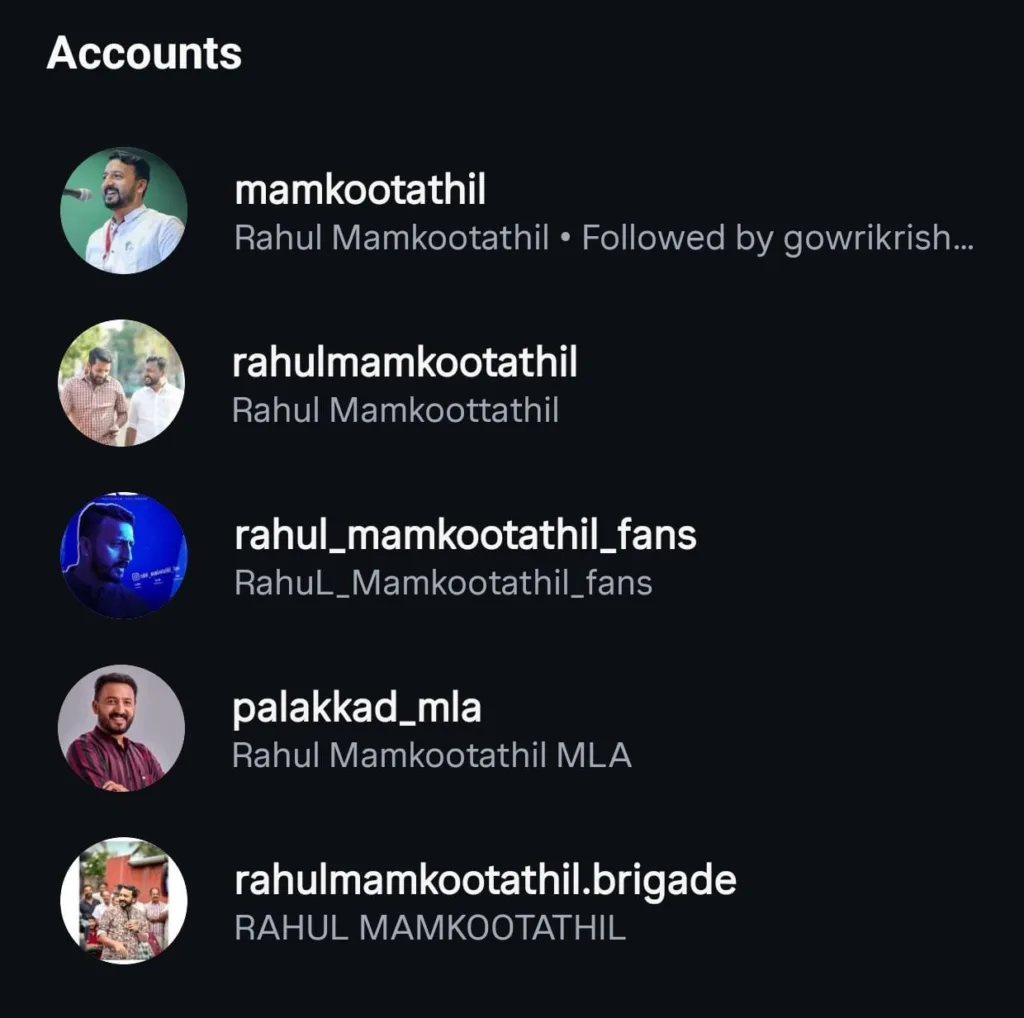 Groups such as Rahul Mamkootathil Fans Association, Rahul Mamkootathil Supporters, and other similar pages have over 2,000 members each. Back in 2023, these groups posted photos of Rahul with captions like “a man of powerful words” and “powerful orator.” They also regularly featured Rahul’s prime-time discussions and speeches. Similar accounts on Instagram also have over 30,000 followers and have been active in Rahul’s election campaigns and activities undertaken as an MLA.
