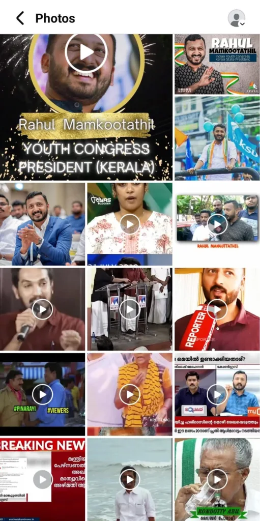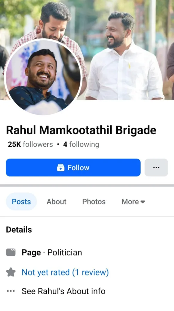 There are many pages, accounts, and groups on Facebook and Instagram that identify themselves as “fans” or “supporters” of Rahul. Many of these were formed around 2021–22, the period when he rose to prominence. These pages have been an important source of amplifying his views and activities, framing him as “the firebrand youth of the Congress.” One such page, called the “Rahul Mamkootathil Brigade,” is a Facebook page with over 25,000 followers. The page was last active in 2023. They had a multitude of Rahul’s pictures, with captions praising his courage, his public statements and activities.