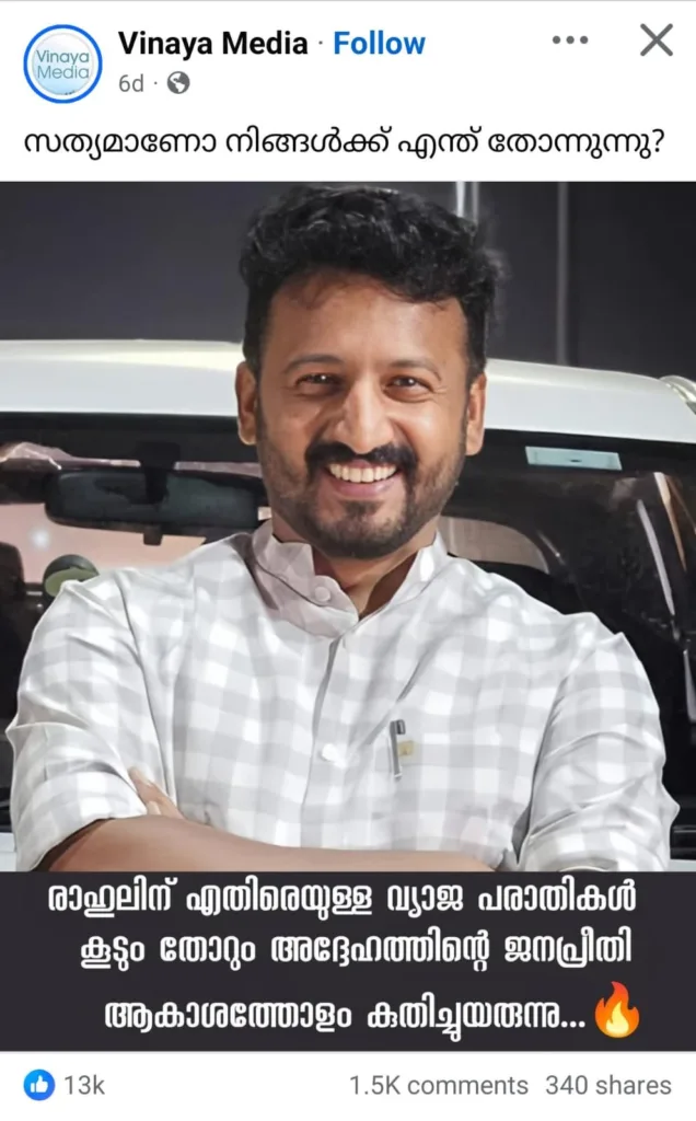 More than these ‘open fans’ wooing over him, many so-called “neutral” pages have also played a role in promoting his presence. Mollywood Connect posted a picture of him with the caption “unconditionally with him” on November 27. Tracing back to 2023, pages like Kalayanthayani Kazhchakal, which has over 1 million followers, posted a video of Rahul speaking against Veena Vijayan, Chief Minister Pinarayi Vijayan’s daughter. The page captioned it, “You could have stopped killing him, but you went on to cut him into pieces,” a remark suggesting how brutally he roasted the CPI(M).
