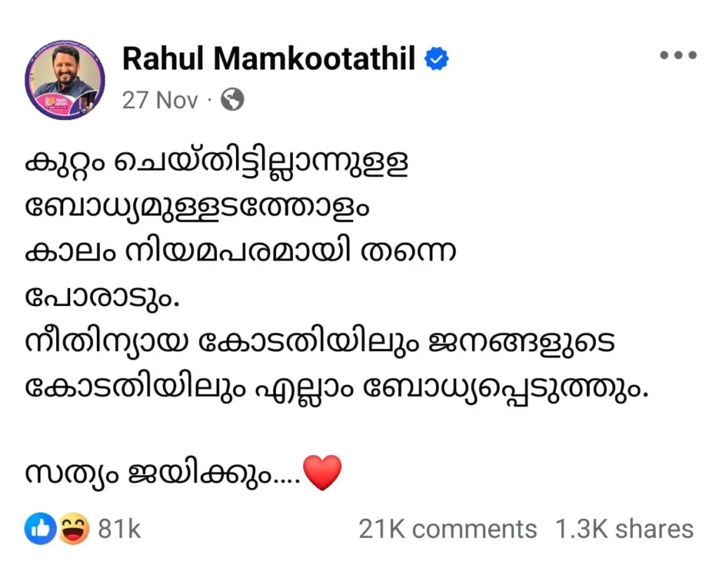 “As long as I have the conviction that I haven’t done anything wrong, I will continue to fight legally. I will prove everything in the court of law and the court of the people. Truth will win.” The last Facebook post shared by Rahul Mamkootathil on November 27 garnered over 80,000 likes and 1,300 shares.