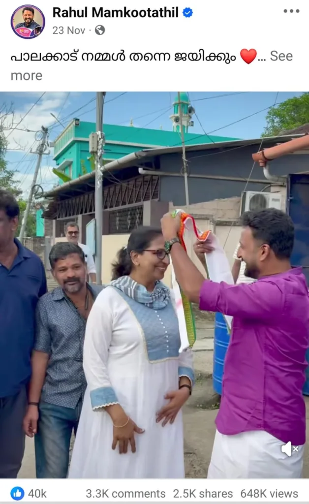 Rahul also utilised the power of Instagram and Facebook reels very effectively early on. Even after he stepped down from Congress positions in August, he posted reel videos of him campaigning in Palakkad, carrying forward the activities of the SMILE housing scheme (SMILE is an MLA’s initiative to construct and provide houses to eligible families in the Palakkad constituency) taking part in the Kalpathi Ratholsavam (an annual temple festival in Palakkad), and even personal celebrations. They continued to garner around 20,000–50,000 likes.