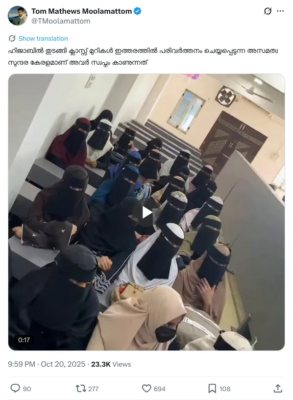 A social media user on X (Formerly Twitter) shared a video on October 20, 2025, with a Malayalam caption that translates to,”Starting with the hijab, transforming classrooms in this way is the unequal, beautiful Kerala they dream of.” The post received around 23,300 views, 694 likes, and 277 reposts.
