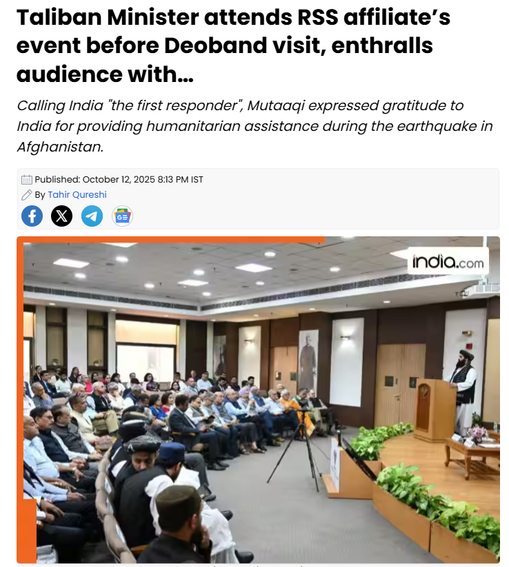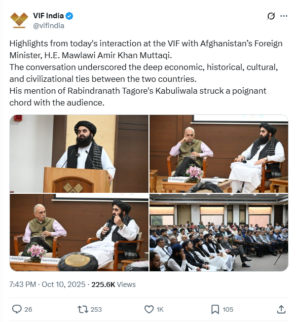 ആർഎസ്എസുമായി ബന്ധമുള്ള സ്ഥാപനമായ വിവേകാനന്ദ ഇന്റർനാഷണൽ ഫൗണ്ടേഷൻ 2025 ഒക്ടോബർ 10 നാണ് ചിത്രം അപ്പ്ലോഡ് ചെയ്തതിരിക്കുന്നത്. “അഫ്ഗാനിസ്ഥാൻ വിദേശകാര്യ മന്ത്രി അമീർ ഖാൻ മുത്തഖിയുമായി വിഐഎഫിൽ നടന്ന സംഭാഷണത്തിൻ്റെ പ്രസക്തഭാഗങ്ങൾ – രബീന്ദ്രനാഥ ടാഗോറിന്റെ കാബൂളിവാലയെക്കുറിച്ചുള്ള അദ്ദേഹത്തിന്റെ പരാമർശം സദസ്സിനെ ആകര്ഷിച്ചു ” എന്ന വിവരണത്തോടെയുള്ള പോസ്റ്റ് ചെയ്തിരിക്കുന്ന ചിത്രത്തില് സ്ത്രീകളേയും കാണാം.