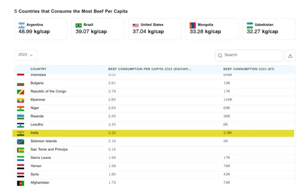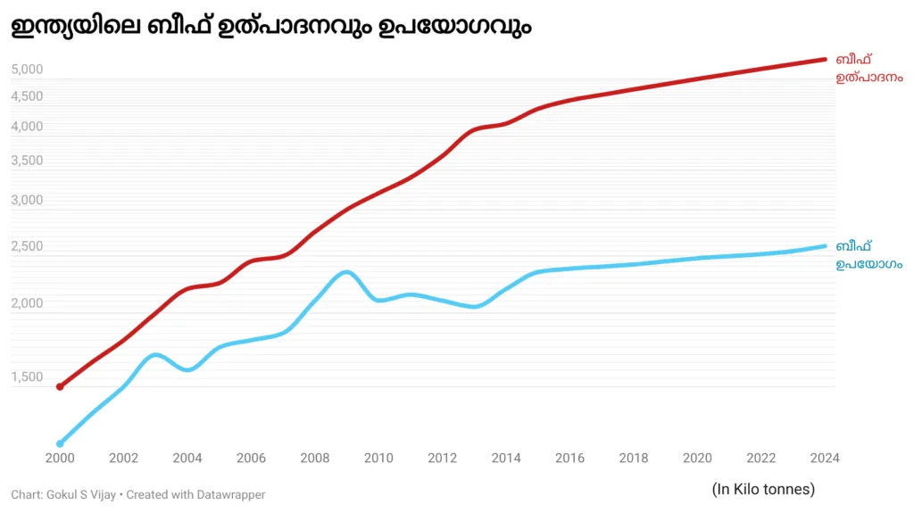 യുഎസ് കാർഷിക ഡിപാർട്ട്മെൻറ് കണക്കുകൾ പ്രകാരം ഇന്ത്യയിൽ 2050 കിലോ ടൺ ബീഫാണ് 2013 ൽ ഉപയോഗിച്ചത്. 2025 ലെത്തുമ്പോൾ ഈ കണക്കിൽ വലിയ വർധന രേഖപ്പെടുത്തിയിരിക്കുന്നു. 3060 കിലോ ടൺ ബീഫാണ് 2025 ൽ രാജ്യത്ത് ഉപയോഗിച്ചത്. അതായത്, ബീഫിന്റെ ഉപയോഗത്തിൽ പന്ത്രണ്ട് വർഷത്തിൽ ഏതാണ്ട് 48 ശതമാനം വളർച്ച. വിവാദങ്ങളും ആക്രമണങ്ങളും പശു മാംസത്തെ പറ്റിയാണെങ്കിലും കണക്കുകളിൽ ‘ബീഫ്’ എന്നാൽ എരുമ മാംസവും കൂടിയാണ്.