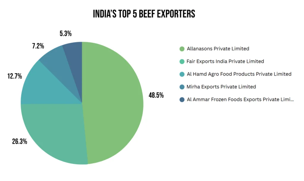 ഫെയർ എക്സ്പോർട്ട്സ് ഇന്ത്യ (Fair Exports India), അൽ ഹംദ് അഗ്രോ ഫുഡ് പ്രൊഡക്റ്റ്സ് (Al Hamd Agro Food Products), മിർഹ (Mirha Exports), അൽ അമ്മർ ഫ്രോസൺ ഫുഡ്സ് എക്സ്പോർട്സ് (Al Ammar Frozen Foods Exports) എന്നീ കമ്പനികളാണ് ബീഫ് കയറ്റു മതിയിൽ രണ്ട് മുതൽ അഞ്ച് വരെ സ്ഥാനങ്ങളിലുള്ളത്. ഈ കമ്പനികളുടെ ആസ്ഥാനങ്ങൾ സ്ഥിതി ചെയ്യുന്ന സംസ്ഥാനങ്ങൾ നോക്കിയാൽ ബിജെപി ഉയർത്തുന്ന ‘ബീഫ് രാഷ്ട്രീയ’ത്തിന്റെ യഥാർത്ഥ മുഖം വ്യക്തമാവും. ഒന്ന്, രണ്ട് സ്ഥാനങ്ങളിലുള്ള അല്ലാന, ഫെയർ കമ്പനികളുടെ ആസ്ഥാനം മഹാരാഷ്ട്രയാണ്. കഴിഞ്ഞ പന്ത്രണ്ട് വർഷങ്ങളിൽ പത്ത് കൊല്ലവും മഹാരാഷ്ട്ര ഭരിച്ചത് ബിജെപി കക്ഷിയായുള്ള സർക്കാരുകളാണ്. മൂന്നാം സ്ഥാനത്തുള്ള അൽ ഹംദ് എന്ന കമ്പനിയുടെ ആസ്ഥാനം ഉത്തർപ്രദേശാണ്. 4,5 സ്ഥാനങ്ങളിലുള്ള മിർഹ, അൽ അമ്മർ കമ്പനികളുടെ ആസ്ഥാനം കഴിഞ്ഞ പതിനൊന്ന് വർഷങ്ങളായി ബിജെപി ഭരിക്കുന്ന ഹരിയാനയാണ്. ഈ രണ്ട് സംസ്ഥാനങ്ങളിലും ‘ഗോ സംരക്ഷകരുടെ അക്രമങ്ങളും’ സ്ഥിരമായി റിപ്പോർട്ട് ചെയ്യപ്പെട്ടിട്ടുണ്ട്.