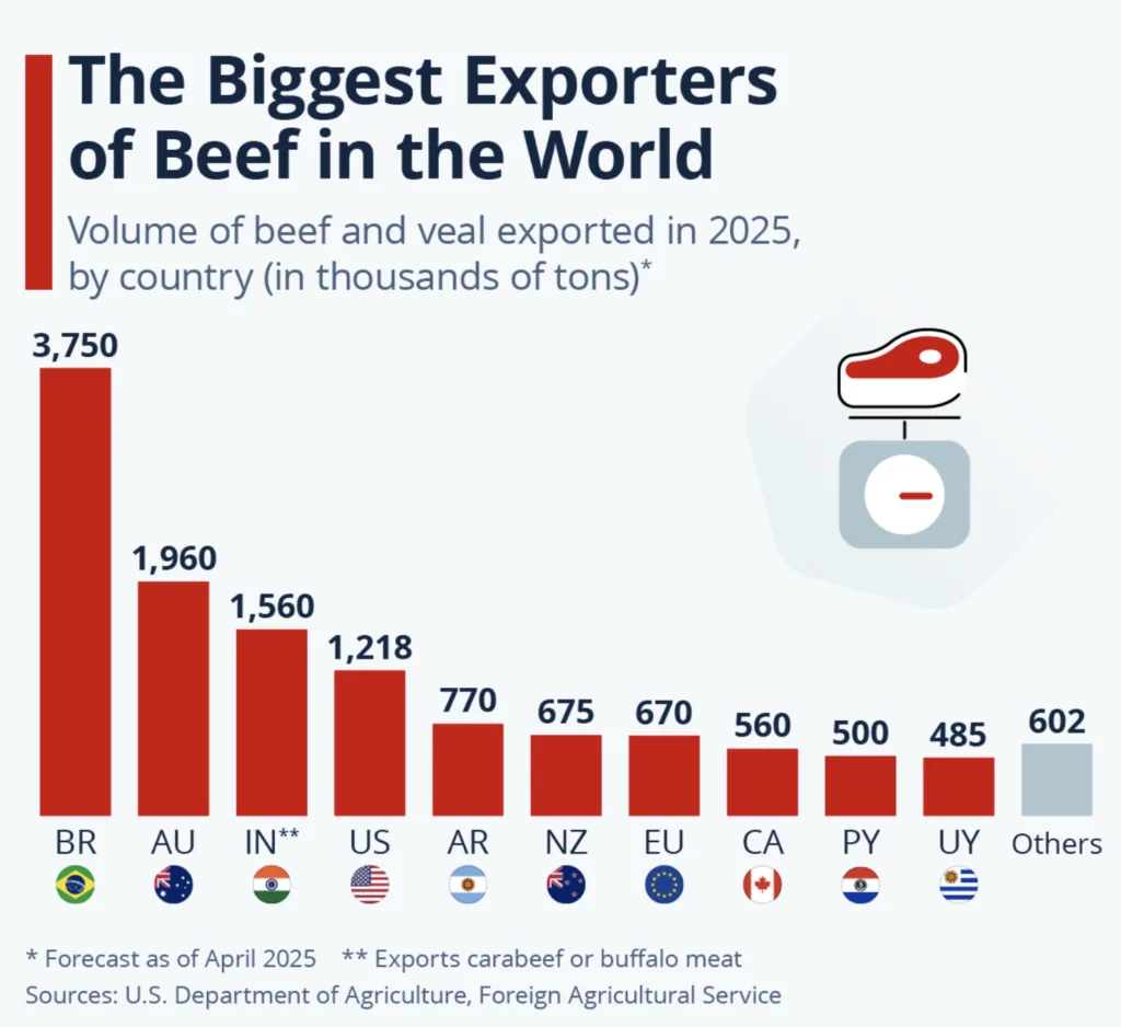 ലോകത്ത് ഏറ്റവും കൂടുതൽ ബീഫ് കയറ്റുമതി ചെയ്യുന്ന രാജ്യങ്ങളിൽ മൂന്നാം സ്ഥാനത്താണ് ഇന്ത്യ. മൊത്തം ബീഫ് ഉത്പാദനത്തിന്റെ 34 ശതമാനം മാത്രമാണ് രാജ്യം കയറ്റുമതി ചെയ്യുന്നത്. വാണിജ്യ മന്ത്രാലയത്തിന്റെ കണക്കുകളനുസരിച്ച് 2025 ൽ ഇന്ത്യയുടെ ബീഫ് കയറ്റുമതി വരുമാനം ഏതാണ്ട് 34,000 കോടി രൂപയാണ്. 2012 ലെ ഫോറിൻ ട്രേഡ് പോളിസി അനുസരിച്ച് ഇന്ത്യയിൽ കാള, പശു എന്നിവയുടെ മാംസം കയറ്റുമതി ചെയ്യുന്നത് പൂർണമായും നിരോധിച്ചിട്ടുണ്ട്. കണക്കുകളനുസരിച്ച് ഇന്ത്യയിൽ ഏറ്റവുമധികം കയറ്റുമതി ചെയ്യുന്ന ബീഫ് മാംസം എരുമയുടേതാണ്.