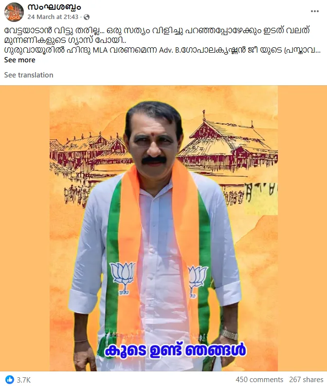 ‘വേട്ടയാടാൻ വിട്ടു തരില്ല’ എന്നും പ്രസ്താവനയോട് നൂറു ശതമാനം യോജിക്കുന്നുവെന്നുമാണ് പോസ്റ്റിൽ പറയുന്നത്. 461 കമൻ്റുകളും 275 ഷെയറുകളും ഇതുവരെ (മാർച്ച് 26) ആ പോസ്റ്റിന് ലഭിച്ചിട്ടുണ്ട്. കമൻ്റുകൾ മുഴുവൻ ഗോപാലകൃഷ്ണനെ പിന്തുണയ്ക്കുന്നവയാണ്. ഹിന്ദുസ്ഥാൻ്റെ കാവിപ്പട, മെട്രോമാൻ (ഗ്രൂപ്പ്), സംഘ സാരഥി എന്നീ അക്കൗണ്ടുകളിൽ ഇതേ കുറിപ്പ് കോപ്പി പേസ്റ്റ് ചെയ്തു ചേർത്തിട്ടുണ്ട് എന്നുകാണാം. രോഹിണി വർമ്മ എന്ന വലതുപക്ഷ എക്സ് അക്കൗണ്ടും ഈ പോസ്റ്റ് പങ്കുവച്ചിട്ടുണ്ട്. ദിനംപ്രതി ബിജെപി അനുകൂല പോസ്റ്റുകൾ പങ്കുവയ്ക്കുന്ന ഒരു പേജ് ആണിത്. ഇപ്പോഴും ഈ പോസ്റ്റ് പ്രചരിക്കുന്നുണ്ട്.