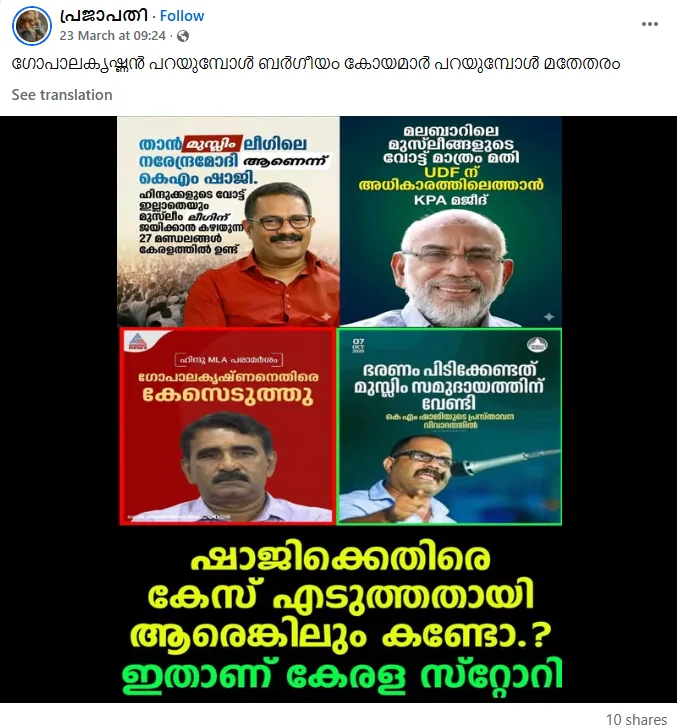 മുസ്ലിം ലീഗ് നേതാക്കളായ കെ.എം. ഷാജി, കെ.പി.എ. മജീദ് തുടങ്ങിയവരുടെ സോഷ്യൽ മീഡിയ ഹാൻഡിലുകളെയും അവരുടെ രാഷ്ട്രീയ പ്രസ്താവനകളെയും ലക്ഷ്യം വെച്ചുകൊണ്ടാണ് പല വലതുപക്ഷ അക്കൗണ്ടുകളും പ്രവർത്തിക്കുന്നത് എന്ന് മനസിലാകുന്നു. ‘പ്രജാപതി’ പോലുള്ള ഹാൻഡിലുകൾ ഇവരുടെ ഓരോ പോസ്റ്റിനെയും നിരീക്ഷിച്ച്, അതിലെ ഭാഗങ്ങള് പ്രചരിപ്പിക്കുന്നു. തീവ്ര വലതുപക്ഷ പോസ്റ്റുകൾ മാത്രം പങ്കുവയ്ക്കുന്ന ഒരു അക്കൗണ്ടാണ് പ്രജാപതി.