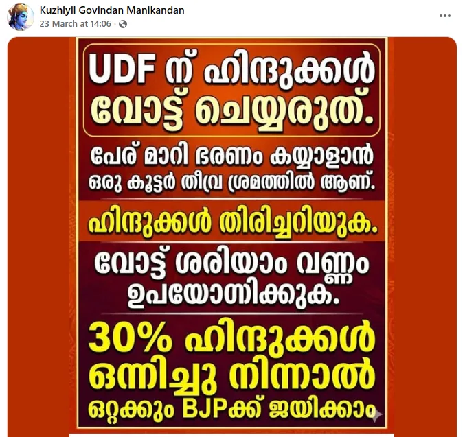 “യുഡിഎഫിന് ഹിന്ദുക്കൾ വോട്ട് ചെയ്യരുത്, പേര് മാറി ഭരണം കയ്യാളാൻ ഒരു കൂട്ടർ തീവ്രശ്രമത്തിലാണ്, ഹിന്ദുക്കൾ തിരിച്ചറിയുക, വോട്ട് ശരിയാംവണ്ണം ഉപയോഗിക്കുക, 30% ഹിന്ദുക്കൾ ഒന്നിച്ചു നിന്നാൽ ഒറ്റയ്ക്കും ബിജെപിക്ക് ജയിക്കാം” എന്ന ആഹ്വാനമാണ് മറ്റൊന്ന്.