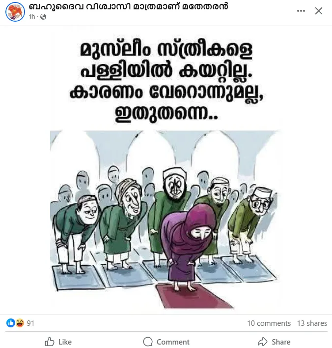 “മുസ്ലിം സ്ത്രീകളെ പള്ളിയിൽ കയറ്റില്ല, കാരണം വേറൊന്നുമല്ല ഇതുതന്നെ” എന്ന കുറിപ്പോടെ ഒരു കാർട്ടൂൺ പോസ്റ്റ് ചെയ്തത് ‘ബഹുദൈവ വിശ്വാസി മാത്രമാണ് മതേതരൻ’ എന്ന ഫേസ്ബുക്ക് പേജിലൂടെയാണ്. തീവ്ര വലതുപക്ഷ പോസ്റ്റുകൾ പങ്കുവയ്ക്കുന്ന ഒരു അക്കൗണ്ടാണിത്. നിസ്കരിക്കുന്ന പുരുഷന്മാർക്കിടയിൽ ഒരു സ്ത്രീ നിൽക്കുന്നതും പുരുഷന്മാർ ആ സ്ത്രീയെ തുറിച്ചു നോക്കുന്നതുമാണ് കാർട്ടൂണിലെ ചിത്രീകരണം.