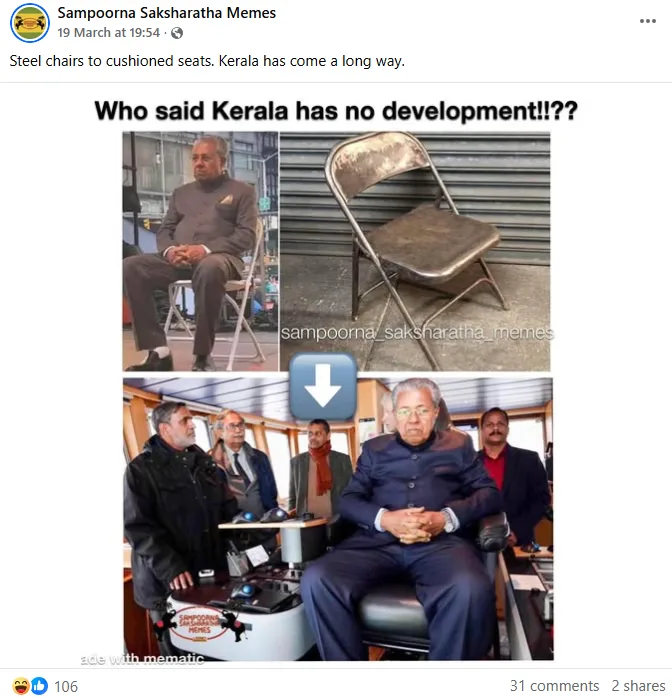 എന്നാൽ, മൂന്ന് വർഷത്തിന് ശേഷം ഈ പഴയ ചിത്രം വീണ്ടും ചില വലതുപക്ഷ അക്കൗണ്ടുകൾ ബോധപൂർവ്വം പ്രചരിപ്പിക്കുകയാണ്. ഇരുമ്പ് കസേരയിൽ മുഖ്യമന്ത്രി ഇരിക്കുന്ന ചിത്രവും, അതേ വേഷത്തിൽ അദ്ദേഹം മറ്റൊരു കുഷ്യൻ കസേരയിൽ ഇരിക്കുന്ന ചിത്രവും തമ്മിൽ താരതമ്യം ചെയ്തുകൊണ്ടാണ് പുതിയ പോസ്റ്റുകൾ വരുന്നത്. “ഇരുമ്പ് കസേരയിൽ നിന്നും കുഷ്യൻ കസേരയിലേക്ക് മുഖ്യമന്ത്രി മാറി, ഇതല്ലേ കേരളത്തിന്റെ വികസനം” എന്ന പരിഹാസത്തോടെയാണ് ഈ പോസ്റ്റ് പങ്കുവെക്കപ്പെട്ടത്.
