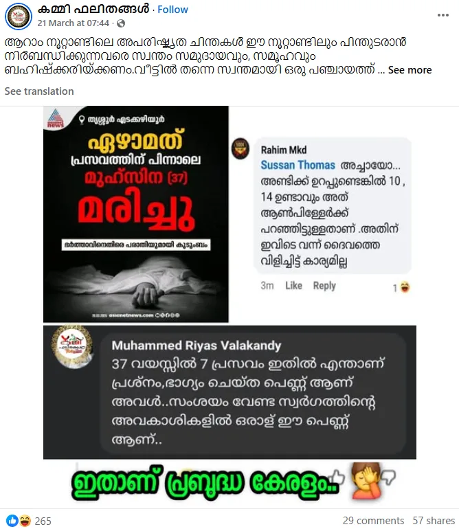 കഴിഞ്ഞദിവസം തൃശൂർ എടക്കഴിയൂരിൽ ഏഴാമത്തെ പ്രസവത്തിന് പിന്നാലെ 37 വയസ്സുകാരിയായ മുഹ്സിന മരണപ്പെട്ട സംഭവത്തെ, മുസ്ലിം സമുദായത്തിനെതിരെ വെറുപ്പ് പ്രചരിപ്പിക്കാനാണ് ചില സോഷ്യൽ മീഡിയ പേജുകൾ ഉപയോഗിക്കുന്നത്. മൂന്ന് ലക്ഷത്തിലധികം ഫോളോവേഴ്സുള്ള ‘കമ്മി ഫലിതങ്ങൾ’ പോലുള്ള പേജുകൾ ഈ വാർത്തയെ ഇസ്ലാം മതവിശ്വാസത്തോടും ജനസംഖ്യാ വർദ്ധനവിനോടും ബന്ധിപ്പിച്ച് പരിഹാസരൂപേണ അവതരിപ്പിച്ചിരിക്കുന്നു.