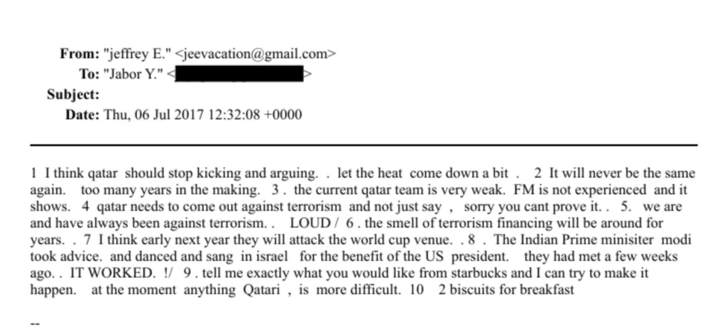 2025 ൽ പുറത്ത് വിട്ട രേഖകളിൽ പലയിടത്തായി പ്രധാനമന്ത്രി നരേന്ദ്ര മോദിയുടെ പേര് പരാമർശിക്കുന്നുണ്ട്. 2017 ജൂലൈ ആറിന് എപ്സ്റ്റീൻ ‘ജാബർ വൈ’ എന്ന മേൽവിലാസത്തിലേക്ക് അയച്ച ഇമെയിലിൽ നരേന്ദ്ര മോദിയുടെ പേരുണ്ട്. 2017 ജൂലൈ 4 മുതൽ 6 വരെ നടന്ന മോദി – ഇസ്രായേൽ കൂടിക്കാഴ്ചയിൽ യുഎസ് പ്രസിഡന്റ് ഡൊണാൾഡ് ട്രംപിന് പങ്കുണ്ടെന്നാണ് ഈ മെയിലിൽ പറയുന്നത്. “ഇന്ത്യൻ പ്രധാനമന്ത്രി നരേന്ദ്ര മോദി ഉപദേശങ്ങൾ സ്വീകരിച്ചു. യുഎസ് പ്രസിഡന്റിന് ഗുണമുള്ള രീതിയിൽ അയാൾ ഇസ്രായേലിൽ പ്രവർത്തിച്ചു. ഏതാനും ആഴ്ചകൾക്ക് മുൻപ് അവർ കൂടിക്കാഴ്ച നടത്തിയിരുന്നു. അത് ഫലിച്ചു!” എന്നായിരുന്നു എപ്സ്റ്റീൻ അയച്ച ഇമെയിൽ.