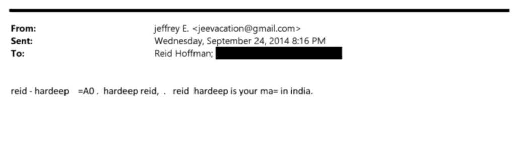 2014 സെപ്റ്റംബർ 24 ന് എപ്സ്റ്റീൻ അമേരിക്കൻ ബിസ്സിനസ്സുകാരനായ റീഡ് ഹോഫ്മാന് അയച്ച ഇമെയിലിൽ ഹർദീപ് സിങ് പുരിയെ പരിചയപ്പെടുത്തുന്നുണ്ട്. തൊഴിൽ സേവന പ്ലാറ്റ്ഫോമായ ‘ലിങ്ക്ഡിൻ’ ന്റെ സഹസ്ഥാപകനാണ് റെഡ് ഹോഫ്മാൻ. “ഇന്ത്യയിൽ താങ്കളുടെ ആൾ പുരിയാണ്” എന്നാണ് എപ്സ്റ്റീൻ പുരിയെ പരിചയപ്പെടുത്തുന്നത്. തുടർന്ന് പുരിയും ഹോഫ്മാനും സിലിക്കൺ വാലിയിൽ കൂടിക്കാഴ്ച്ച നടത്താൻ തീരുമാനിച്ചു.