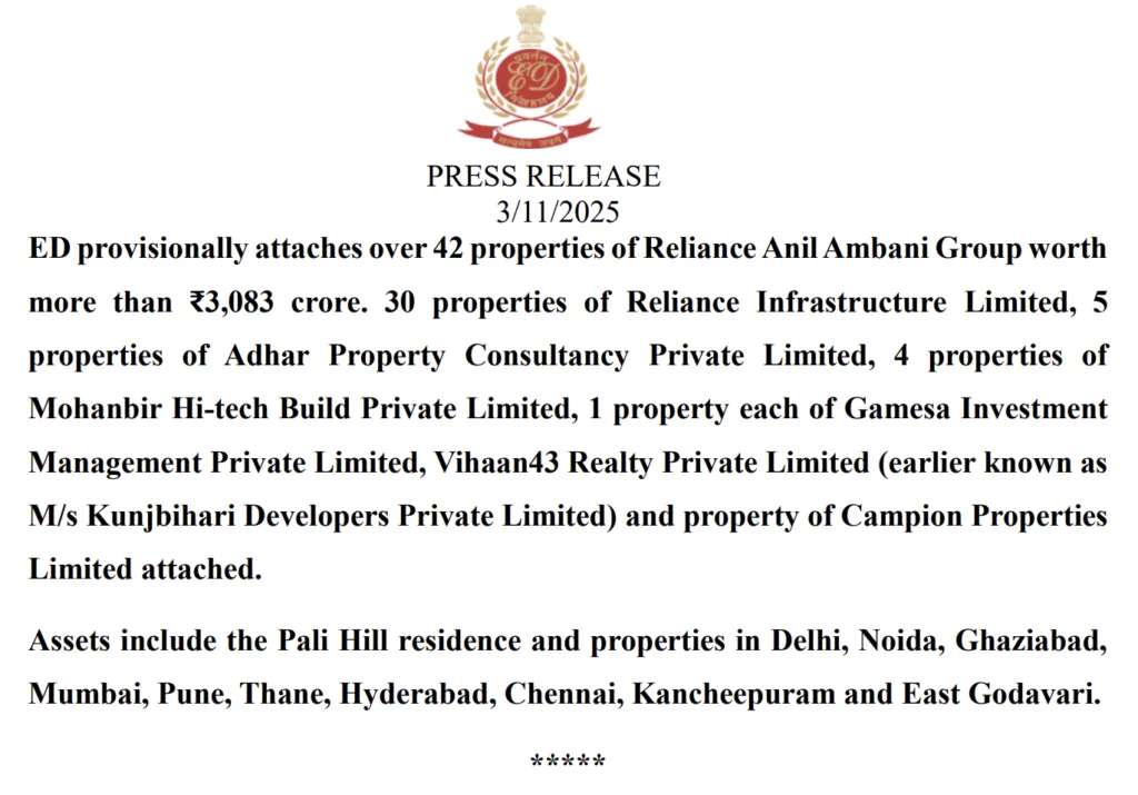നരേന്ദ്ര മോദി അധികാരത്തിലെത്തിയതിന് ശേഷം റഫേൽ കരാറുൾപ്പെടെയുള്ള വിവാദങ്ങളിൽ റിലയൻസ് ഗ്രൂപ്പ് ഉൾപ്പെട്ടിരുന്നു. 2025 ലും 2026 ലുമായി വിവിധ ലോൺ തട്ടിപ്പ് കേസുകളുടെ ഭാഗമായി റിലയൻസ് ഗ്രൂപ്പിന്റെ മൂവായിരത്തോളം കോടി രൂപയുടെ സ്വത്തുക്കളാണ് എൻഫോഴ്സ്മെൻറ് ഡയറക്ടറേറ്റ് കണ്ട്കെട്ടിയത്.