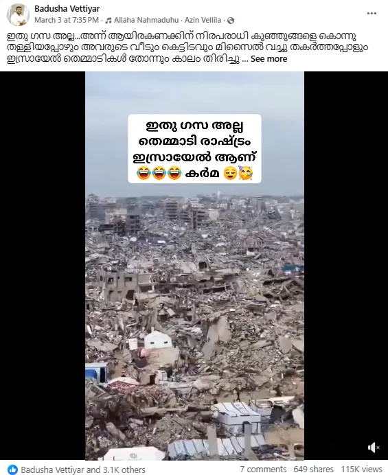 “ഇത് ഗസയല്ല ഗസയെ ഇത് പോലെ ആക്കിയ ഇസ്രയേലിന്റെ ഇപ്പഴത്തെ അവസ്ഥയാണ്” എന്ന അടിക്കുറിപ്പോടെ മറ്റൊരു ഫേസ്ബുക്ക് അക്കൗണ്ടിലും വീഡിയോ പ്രചരിക്കുന്നതായി കണ്ടു.