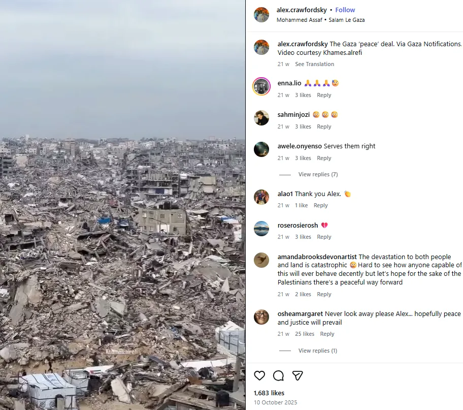 “The Gaza ‘peace’ deal. Via Gaza Notifications.” എന്ന് ക്യാപ്ഷനിൽ രേഖപ്പെടുത്തിയിരിക്കുന്നത് കാണാം. അതോടൊപ്പം, Khames.alrefi എന്ന് Video courtesy ഉം കൊടുത്തിരിക്കുന്നു.