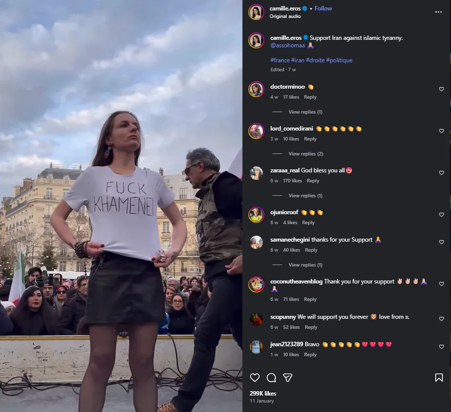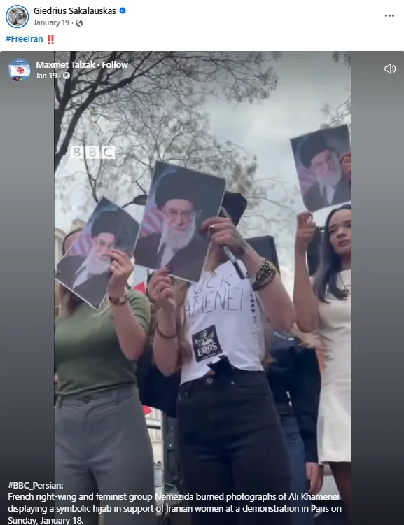 “ജനുവരി 18 ഞായറാഴ്ച പാരീസിൽ നടന്ന ഒരു പ്രകടനത്തിൽ ഇറാനിയൻ സ്ത്രീകളെ പിന്തുണച്ചുകൊണ്ട് ഫ്രഞ്ച് വലതുപക്ഷ, ഫെമിനിസ്റ്റ് ഗ്രൂപ്പായ നെമെസിഡ പ്രതീകാത്മക ഹിജാബ് അഴിക്കുകയും അലി ഖമനെയിയുടെ ഫോട്ടോകൾ കത്തിക്കുകയും ചെയ്തു.”