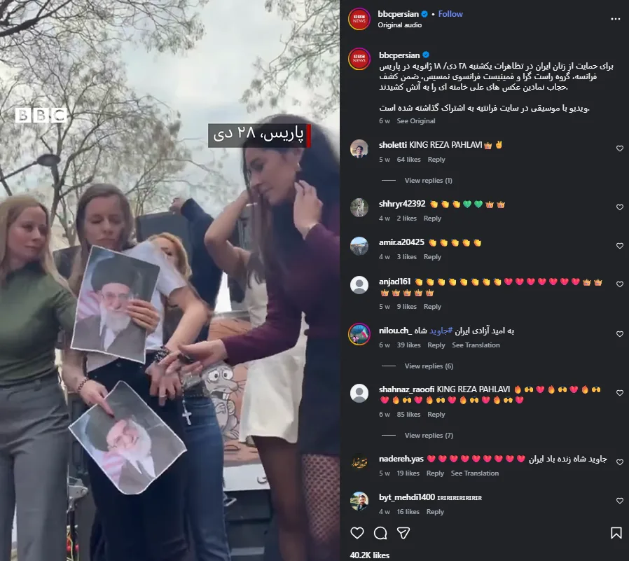 ‘BBC persian’ ന്റെ ഔദ്യോഗിക ഇൻസ്റ്റാഗ്രാം അക്കൗണ്ടിൽ ഈ വീഡിയോ ജനുവരി 19 ന് പോസ്റ്റ് ചെയ്യപ്പെട്ടിട്ടുണ്ട്. ഇറാനിലെ സ്ത്രീകൾക്ക് ഐക്യദാർഢ്യം പ്രഖ്യാപിച്ചുകൊണ്ട് പാരീസിൽ ഫ്രഞ്ച് വലതുപക്ഷ ഫെമിനിസ്റ്റ് ഗ്രൂപ്പ് നടത്തിയ പ്രകടനം എന്നുതന്നെയാണ് ഈ പോസ്റ്റിന്റെയും വിവരണം. Vicegrad 24 എന്ന ഡിജിറ്റൽ മാധ്യമവും ഈ വാർത്ത റിപ്പോർട്ട് ചെയ്തിട്ടുണ്ട്.