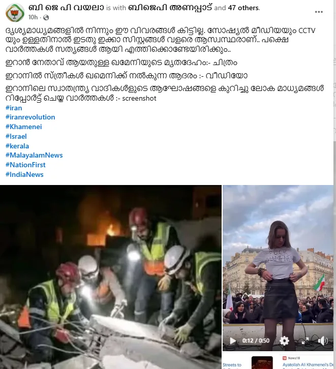 കേരളത്തിലെ വലത് പക്ഷ അക്കൗണ്ടുകൾ പതിവ് പോലെ വ്യാജവാർത്ത ഏറ്റെടുത്തിട്ടുണ്ട്. “ഇറാനിൽ സ്ത്രീകൾ ഖമനെയിക്ക് നൽകുന്ന ആദരം” എന്ന വിവരണത്തോടെ ‘ബിജെപി വയലാ’ എന്നൊരു ഫേസ്ബുക്ക് പേജിലാണ് വീഡിയോ പ്രചരിക്കുന്നത്. ഇറാനില് നിന്നുള്ള മറ്റു ചില പോസ്റ്റുകളുടെ കൂടെ പ്രതിഷേധിക്കുന്ന ഒരു യുവതിയുടെ വീഡിയോ ആണ് പ്രചരിക്കുന്നത്.