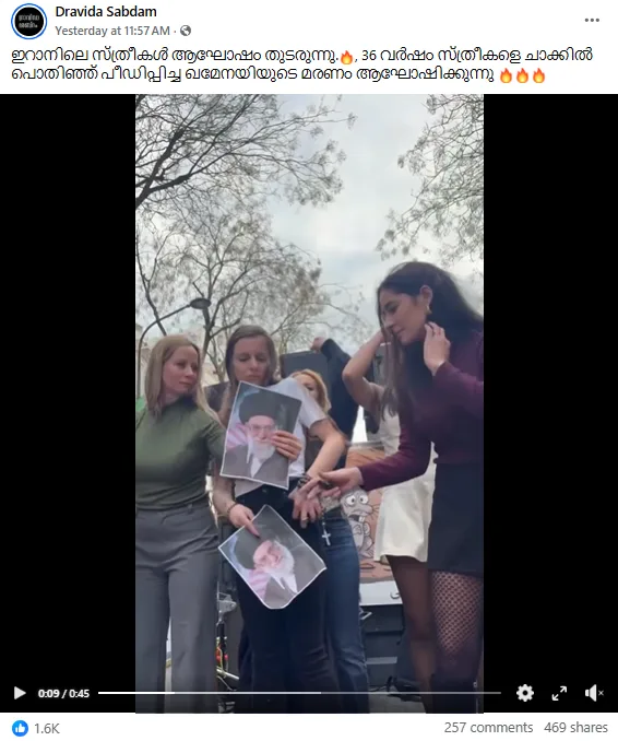 ഖമനെയിയുടെ മരണത്തിൽ, ഇറാന് സ്വാധീനമുള്ള വിവിധ രാജ്യങ്ങളിൽ പ്രതിഷേധങ്ങൾ ഉണ്ടായി. ഇന്ത്യയിൽ ഉൾപ്പെടെ പ്രതിഷേധ പ്രകടനങ്ങൾ നടന്നു. പാകിസ്ഥാനിലും ഇറാഖിലും പ്രതിഷേധങ്ങൾ അക്രമാസക്തമായി. എന്നാൽ ഖമനെയിയുടെ മരണത്തിൽ സന്തോഷിച്ച് കൊണ്ട് ആളുകൾ ആഹ്ളാദ പ്രകടനം നടത്തിയതായും റിപ്പോർട്ട് ചെയ്യപ്പെട്ടു. ഖമനെയിയുടെ മരണത്തിൽ സന്തോഷിക്കുന്ന ഇറാനിലെ സ്ത്രീകൾ എന്ന അവകാശവാദത്തോടെ മലയാളത്തിലും പോസ്റ്റുകൾ വ്യാപകമായി പ്രചരിക്കുന്നുണ്ട്. അത്തരത്തിലൊരു പോസ്റ്റാണ് ‘ദ്രാവിഡ ശബ്ദം’ എന്ന ഒരു ഫേസ് ബുക്ക് അക്കൗണ്ടിലൂടെ പ്രചരിച്ചു തുടങ്ങിയത്.