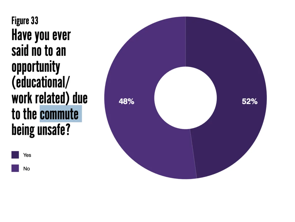 സ്വന്തന്ത്ര ഗവേഷണ സംഘടനയായ ഓബ്സർവർ റിസർച്ച് ഫൗണ്ടേഷന്റെ (ORF) 2021 ലെ സർവേയനുസരിച്ച് രാജ്യത്ത് 52 ശതമാനം സ്ത്രീകളും നിത്യ യാത്ര സുരക്ഷിതമല്ലാത്തതിന്റെ പേരിൽ മാത്രം വിദ്യാഭ്യാസമോ ജോലി സാധ്യതകളോ നിരസിക്കുന്നു.
