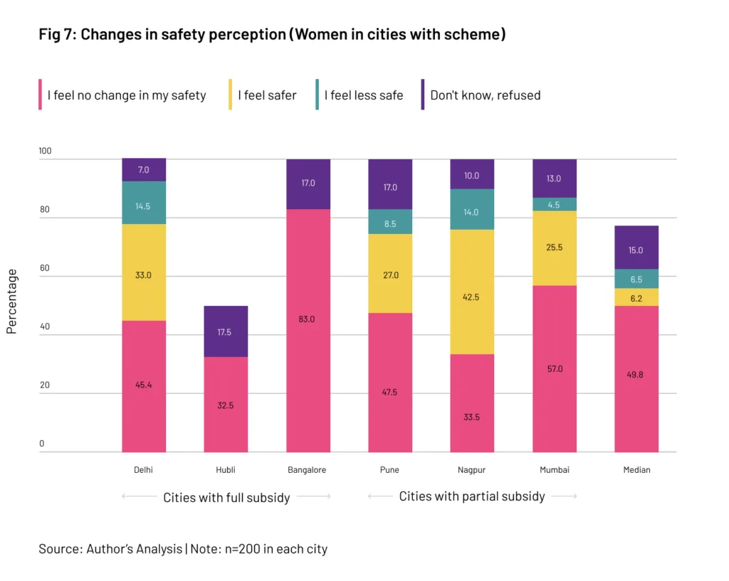 സൗജന്യ യാത്ര പദ്ധതികൾക്കും പൊതുഗതാഗതങ്ങളിൽ സ്ത്രീകൾ നേരിടുന്ന സുരക്ഷാ പ്രശ്നങ്ങളെ അഭിസംബോധന ചെയ്യാൻ മുഴുവനായും സാധിക്കുന്നില്ല. ബാംഗ്ലൂരിലെ ‘ശക്തി’ സ്കീം ഗുണഭോക്താക്കളിൽ നടത്തിയ പഠനങ്ങളിൽ, 83 ശതമാനം സ്ത്രീകൾ ബസുകളിലെ സുരക്ഷിതത്വത്തിൽ വ്യത്യാസമൊന്നും തോന്നുന്നില്ലെന്ന് അഭിപ്രായപ്പെടുന്നു. ബാംഗ്ലൂരിൽ മാത്രം ശക്തി പദ്ധതിയുടെ ഗുണഭോക്താക്കളിൽ 17.5 ശതമാനം പേരും എന്തെങ്കിലും തരത്തിലുള്ള ശാരീരിക അതിക്രമങ്ങൾ നേരിട്ടിട്ടുണ്ട്.