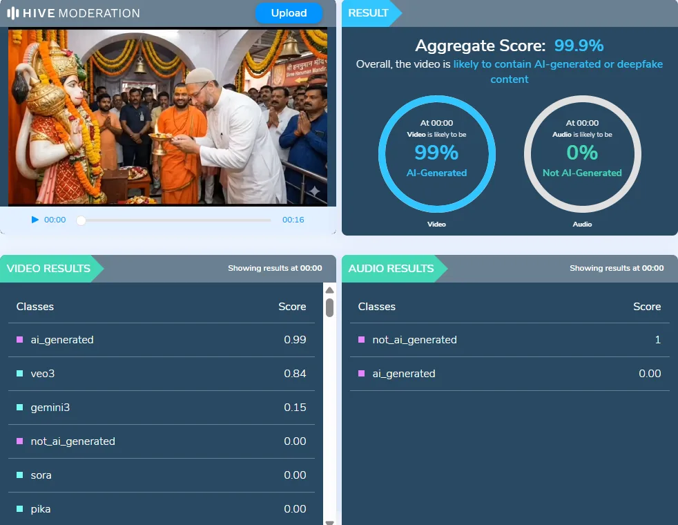 ഹൈദരബാദിൽ നിന്നുള്ള ലോക് സഭാ എം പിയും ഹൈദരബാദ് ആസ്ഥാനമായുള്ള ഓൾ ഇന്ത്യ മജിലിസെ ഇത്തിഹാദുൽ മുസ്ലിമിന്റെ (AIMIM) അധ്യക്ഷനുമായ അസദുദ്ദിൻ ഒവൈസിയുടെ ഒരു വീഡിയോ കഴിഞ്ഞ കുറച്ച് ദിവസങ്ങളായി സാമൂഹ്യ മാധ്യമങ്ങളിൽ പ്രചരിക്കുന്നുണ്ട്. ഹനുമാൻ ക്ഷേത്രത്തിൽ, ആരതിയുഴിയുന്ന ഒവൈസിയുടെ വീഡിയോ ആണ് ഫേസ്ബുക്ക്, ഇൻസ്റ്റാഗ്രാം, എക്സ് തുടങ്ങിയ സാമൂഹ്യ മാധ്യമങ്ങളിൽ വൈറൽ ആയത്. പക്ഷേ, വസ്തുതാ പരിശോധനയിൽ, പ്രചരിക്കുന്ന വീഡിയോ എ ഐ നിർമ്മിതമാണ് എന്ന് കണ്ടെത്തി.